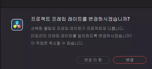그러면 팝업이 나오는데 변경을 누른다. 여기에서 변경을 누른다고 원본 데이터가 변경되는 게 아니므로 안심하고 변경 버튼을 누른다. 참고로, 처음에 미디어탭에 불러온 원본 데이터는 이후에 영상 편집을 진행해도 변경되지 않으므로 안심해도 된다.