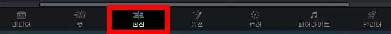 미디어탭 화면에서 영상 편집에 필요한 자료를 불러온 후에 바로 영상 편집 작업을 할 데이터를 아래 공간에 배치했다면, 이후 하단에 있는 7가지 탭 중에서 편집 탭을 누른다.