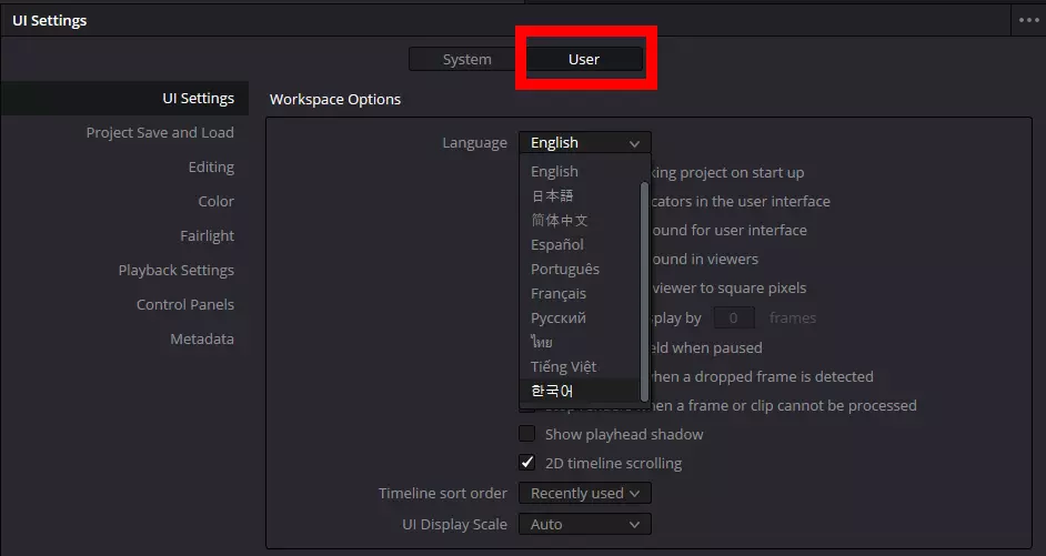 그렇다고 바로 한글 적용이 되는 게 아니므로 반드시 다빈치 리졸브 프로그램을 다시 실행해야만 한글이 적용된 다빈치 리졸브 UI를 볼 수 있다.
