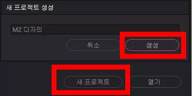 다빈치 리졸브를 실행한 후 나오는 첫 화면에서 우측 하단에 새 프로젝트를 누르면 새 프로젝트 생성 팝업이 나오는데, 여기에 프로젝트명을 입력한 후에 생성 버튼을 누르면 간단히 새로운 프로젝트를 생성할 수 있다. 물론 기존에 작업한 프로젝트가 있다면 해당 프로젝트를 선택하면 된다.