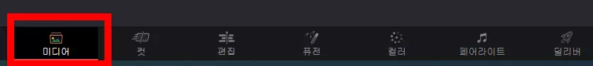 이중 가장 처음에 있는 미디어 탭을 누른다. 그러면 다빈치 리졸브 UI가 미디어 탭 환경으로 전환하는데, 해당 미디어 탭은 간단히 영상 편집할 자료를 가져온 후에 작업 공간에 배치하는 단계이다.