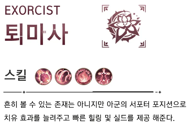 더불어 힐링 능력을 지닌 퇴마사는 아군의 서포터 포지션으로 치유 효과를 발휘하는데 게임 내에서 가장 인기가 없는 클래스이다. 이에 반해 가장 인기가 높은 직업인 검사는 검을 무기로 공격을 하거나 전법을 사용할 수 있는 전투에 최적화되어 있다.