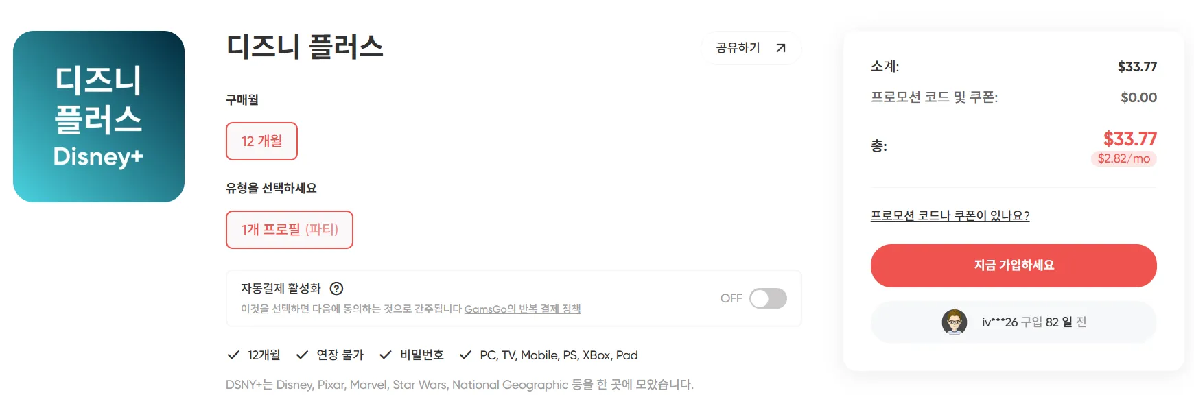 디즈니플러스는 정가가 월 9900원인데 겜스고에서는 2.74달러 즉 4000원 이내의 가격으로 구독이 가능하다. 단, 실제 결제 시에는 해당 가격에 부가세 10%를 추가한 금액이 결제되는데, 그래도 정가에 비해 매우 저렴한 가격이다.