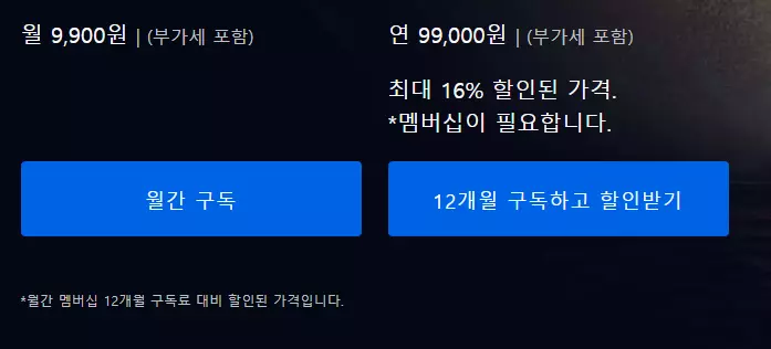 가격은 부가세를 포함해서 월간 멤버십으로 구독하면 9900원이며, 1년 단위로 약정하는 연간 멤버십을 구독하면 부가세를 포함한 가격이 99,000이다.