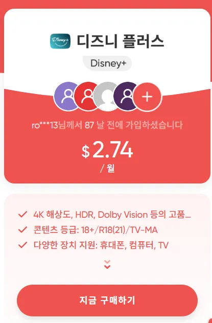 앞에서 언급했듯이 디즈니플러스를 경제적으로 구독하는 방법은 주변 지인들과 함께 공동구매 방식을 활용하는 게 최선이다.