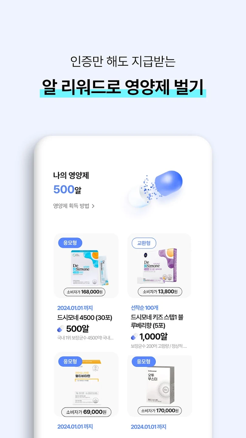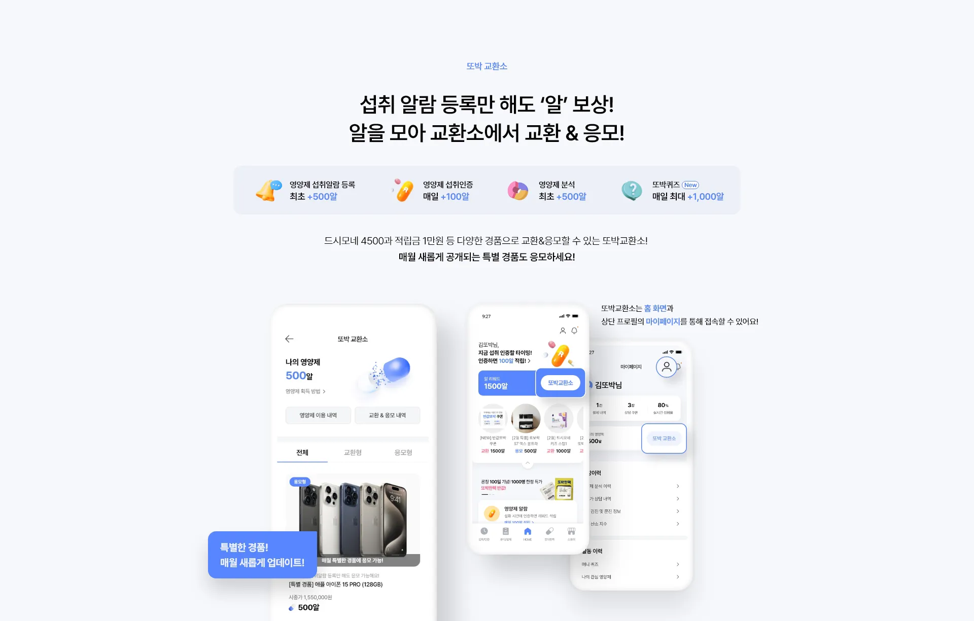 더불어 자신이 먹는 영양제를 등록한 후에 섭취 알람을 추가로 설정하면 알을 보상으로 받을 수 있다. 해당 알은 리워드 성격을 지니고 있어서 교환소에서 또박케어 쇼핑몰에서 판매하는 실제 영양제를 구매할 때 사용하거나, 아이폰과 같은 특별한 경품에 응모할 수도 있다.