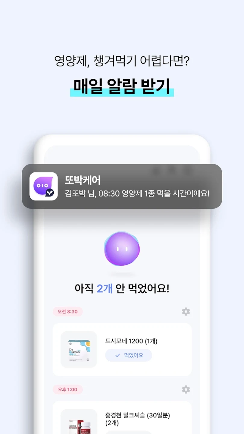 건강한 라이프를 보낼 수 있도록 자신이 먹는 영양제에 부작용은 없는지 더불어 자신에게 맞는 영양제는 뭐가 있는지를 AI가 기존에 먹는 영양제를 분석해서 최적의 성분과 영양제까지 추천하는 또박케어는 간단히 영양제 성분을 분석하고 영양제 섭취 시간을 알려주는 기능에 AI가 추천하는 영양제 정보도 받을 수 있는 영양제 앱이다.