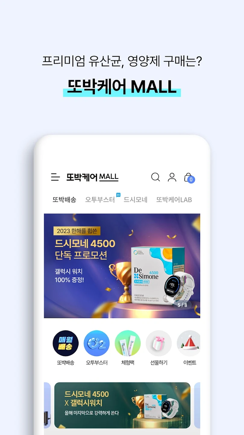 참고로, 또박케어 웹사이트는 그 자체가 영양제 쇼핑몰로 운영되는데, 특별한 유산균 배합에서 만든 영양제로 장 건강을 도모하는 드시모네 등을 판매하는데 별도로 베스트셀러 제품들만 모아서 체험할 수 있도록 구성해서 제공하고 있다.