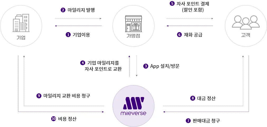 이렇듯 보유한 마일리지를 언제 어디서나 현금처럼 사용할 수 있는 모바일 전용 플랫폼인 마일벌스는 소비자들이 흩어져 있던 마일리지를 모아 마일벌스 포인트로 교환한 후에 다양한 가맹점에소 손쉽게 현금처럼 사용할 수 있는 모바일 결제 플랫폼을 제공한다.