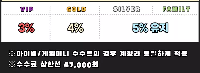 해당 거래 완료 시에 회원 등급에 따라 거래 대금의 3%에서 5% 사이에서 수수료가 결정되는데, 이때 수수료 상한선이 47,000원으로 정해져 있어서 고가의 상품 거래 시에도 과도한 수수료가 발생하지 않는다.