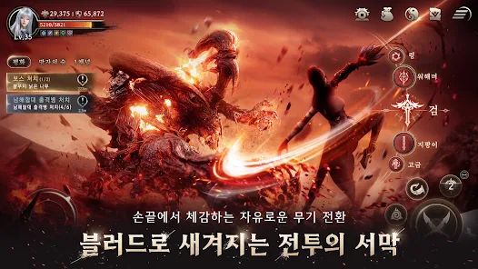 이러한 블러드 앤 소울은 사부의 곁을 떠나 강호로 나아가는 스토리라인을 따라 진행하는데, 바쁠 때는 자동 전투를 활성화해서 플레이하면 되고 여유롭게 액션 스릴을 만끽하려면 수동 전투 방식을 선택하면 된다.