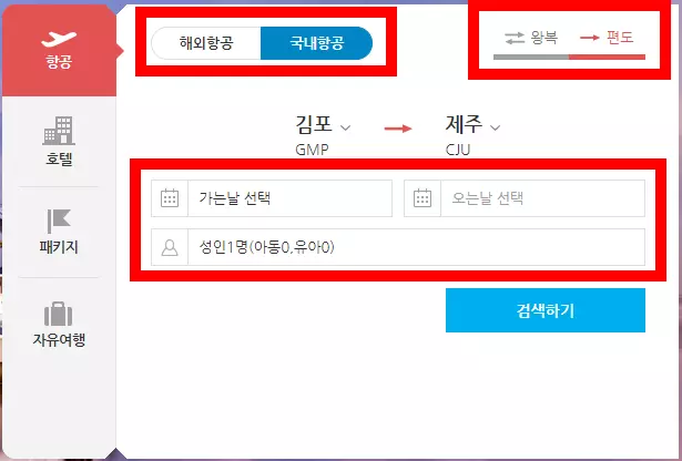 땡처리닷컴에 접속한 후에 전면에 나온 검색 박스를 활용하여 좌측에서 항공, 호텔 등 카테고리를 우선 선택한 후에, 우측에서 세부 항목을 선택한 후에 검색하기 버튼을 누르는 간단한 방식이다.