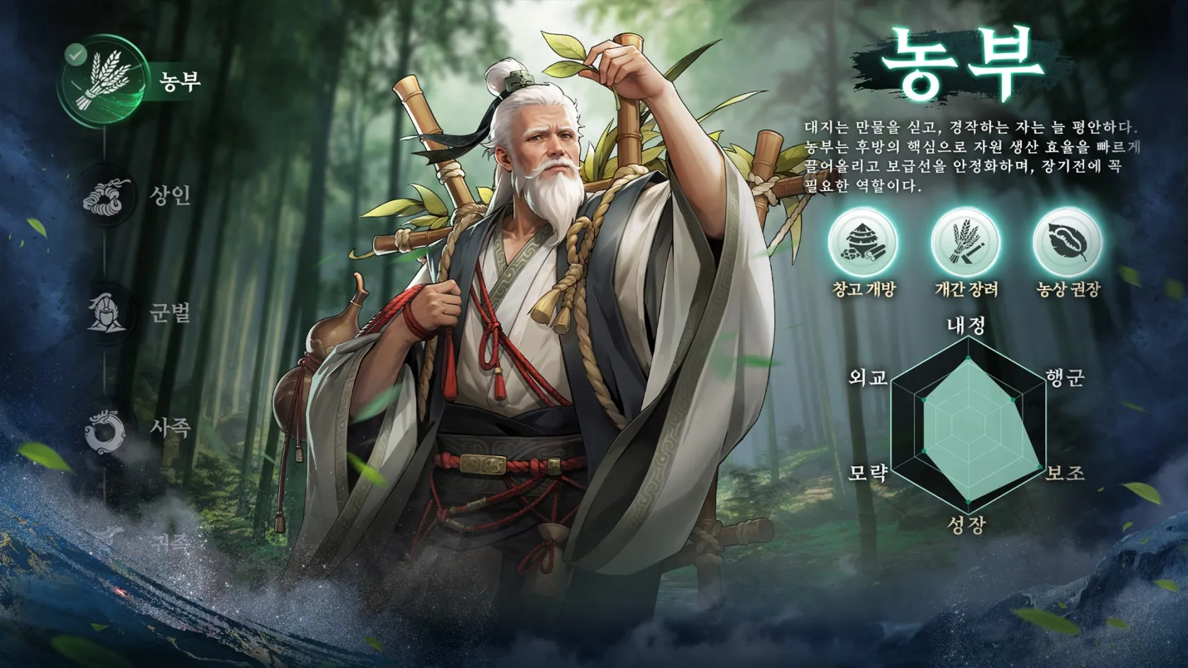 참고로, 게임 시작 시에 선택할 수 있는 4가지 신분의 주요 특징을 중심으로 정리하면 다음과 같다. 우선 농부는 흔들리지 않는 자원 생산과 든든한 보급을 담당할 수 있고, 상인은 무역의 고수이므로 막대한 이익 창출로 경제를 지배할 수 있다. 더불어 군벌은 전장의 선봉장이므로 돌격 능력을 강화하며 아군의 피해를 감소시킬 수 있다. 마지막으로 사족은 도시 관리와 내정의 전문가로 효율적인 자원 배분에 최적화되어 있다.