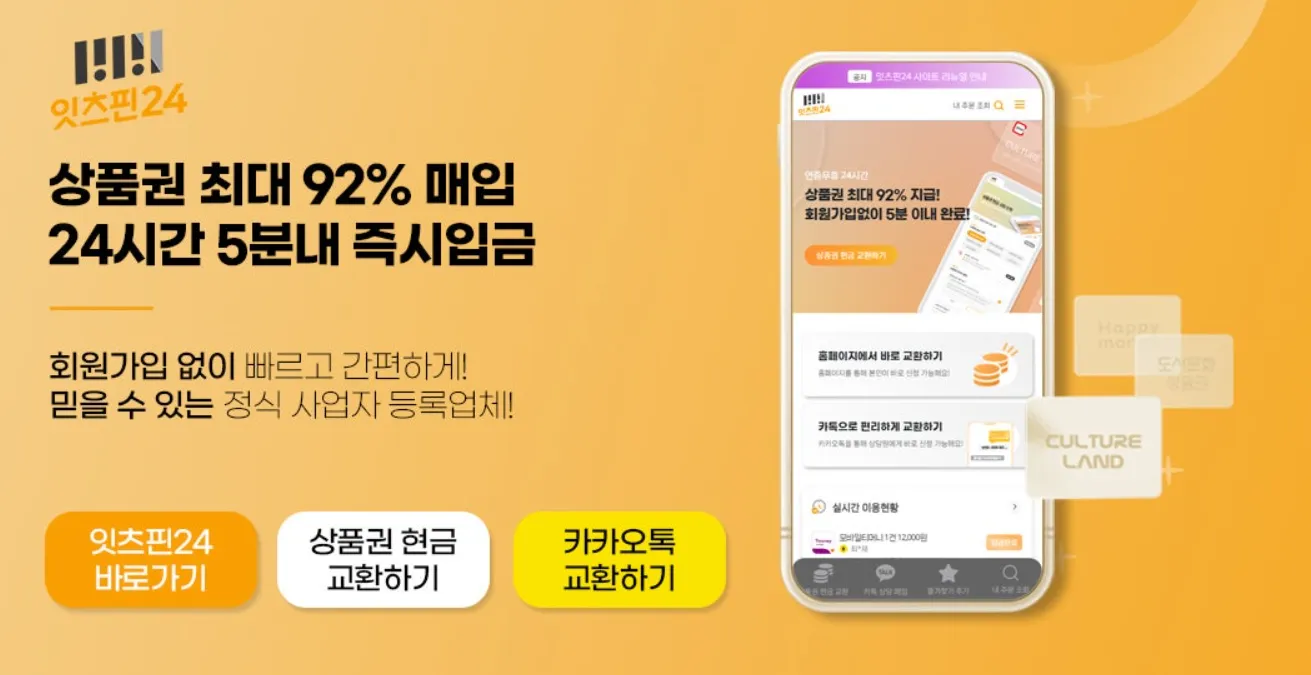정식 사업자 등록이 되어 있는 잇츠핀24는 365일 24시간 운영하는 상품권 매입 및 거래 플랫폼으로 모바일 및 지류 상품권을 비롯하여 티머니, 틴캐시, 쓱머니, 구글카카오톡교환권, 구글기프트카드, 스타벅스e카드교환권 등 시중에서 통용되는 대부분의 상품권을 취급한다.