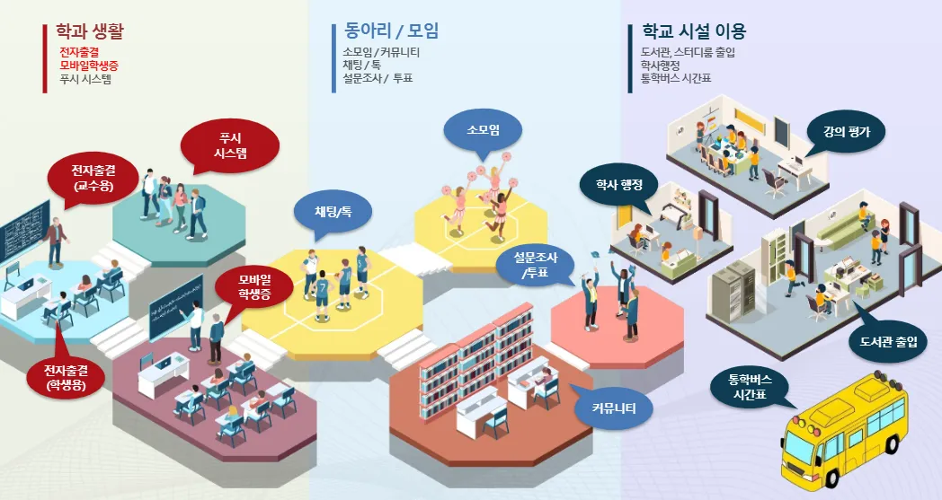 더불어 수강신청을 비롯한 학사행정 업무를 지원할 뿐만 아니라 학교 내 시설인 도서관, 스터디룸 등을 이용 시에 출입증 역할도 하고 있다.