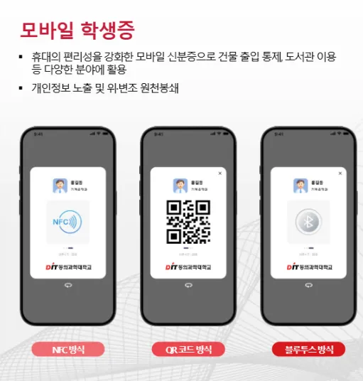 참고로, 대학교 내 도서관을 비롯해서 다양한 시설물 출입 시에 대부분 엄격한 출입 통제를 하므로 해당 모바일 앱에 탑재된 학생증을 NFC 방식을 비롯해서 QR 코드, 블루투스 방식 등으로 다양한 분야에서 활용할 수 있다.