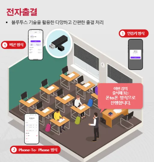 수강 신청한 강의에 참여 시에 스마트폰 내 설치된 앱으로 전자출결을 할 수 있는데, 이때 블루투스 기술을 활용하므로 스마트폰 내 설정에서 블루투스를 활성화해야 한다.