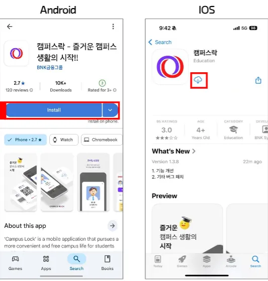 다음으로 아이폰 또는 아이패드와 같은 IOS용 모바일이라면 앱스토어에서 캠퍼스락으로 검색한 후에 즐거운 캠퍼스 생활의 시작!이라는 문구가 추가된 항목을 선택해서 설치하면 된다.