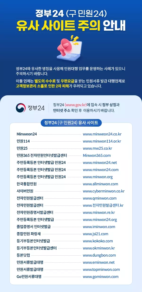 특히 과거 민원24로 대표되던 정부 지원 사이트가 이제는 정부24로 통합되면서 더 이상 운영하지 않으므로 각별하게 주의할 필요가 있다.