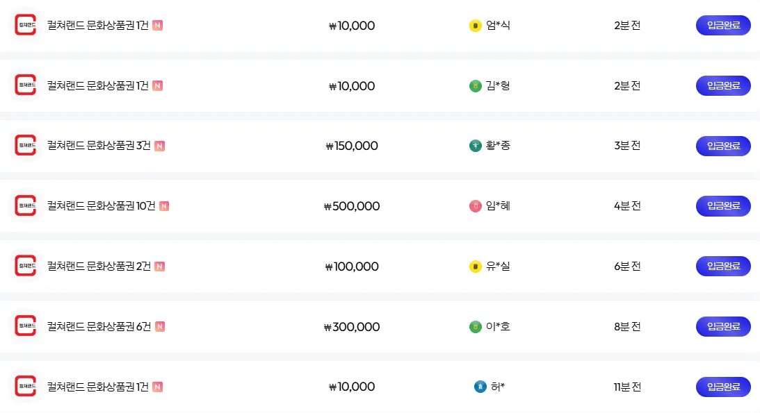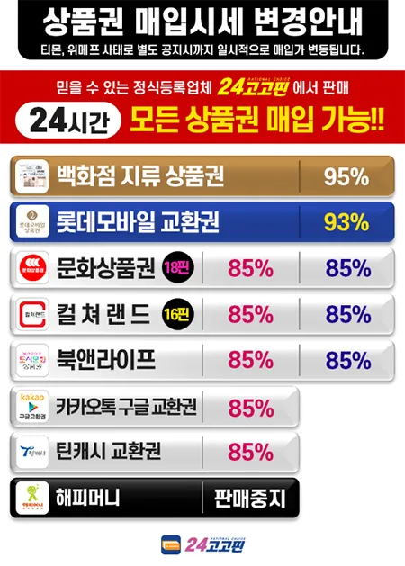 최대 95% 최고가 상품권 매입을 전면에 내세우는 24고고핀은 거의 모든 상품권을 현금화할 수 있는데, 365일 연중무휴 24시간 실시간 매입을 지원하는데 신청 즉시 1분 이내에 상품권 매입 후 현금을 받을 수 있다.
