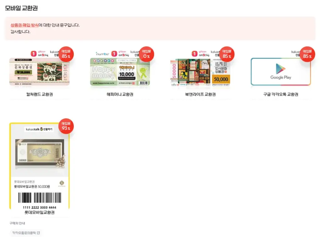 이외에 다른 상품권도 시기에 따라 약간의 매입가 차이는 존재하지만 대부분 85% 이상의 매입가를 지원하고 있다.