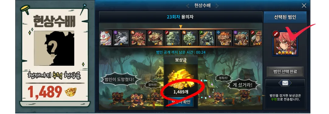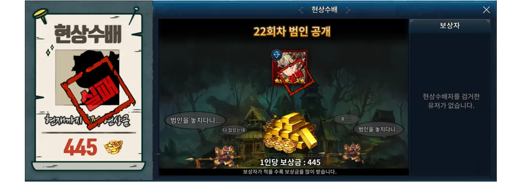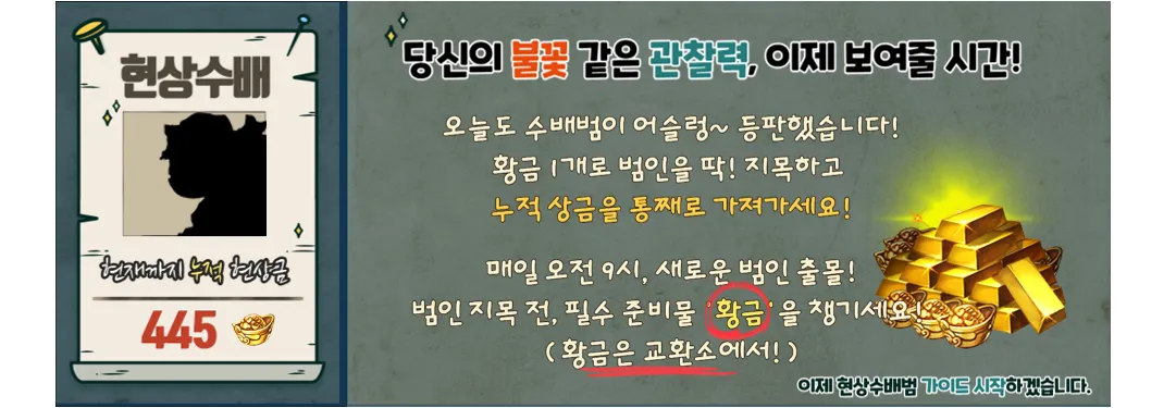 단, 해당 현상수배 이벤트에 참여한 후에 범인을 지목하려면 황금 1개가 필요한데, 황금은 게임 내 시장에 있는 교환소 내 이벤트 탭에서 교환할 수 있다.