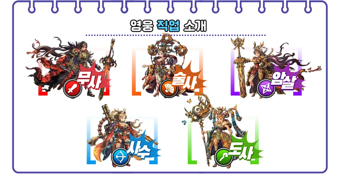 해당 게임에서 등장하는 영웅은 무사, 술사, 암살, 사수, 도사라는 5가지 직업으로 분류되는데, 각각의 직업마다 고유한 전투 스타일과 스킬이 존재하므로 이러한 직업의 특징을 고려해서 유저만의 팀을 구성해야 한다.