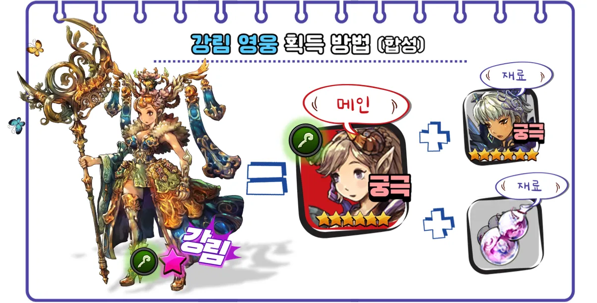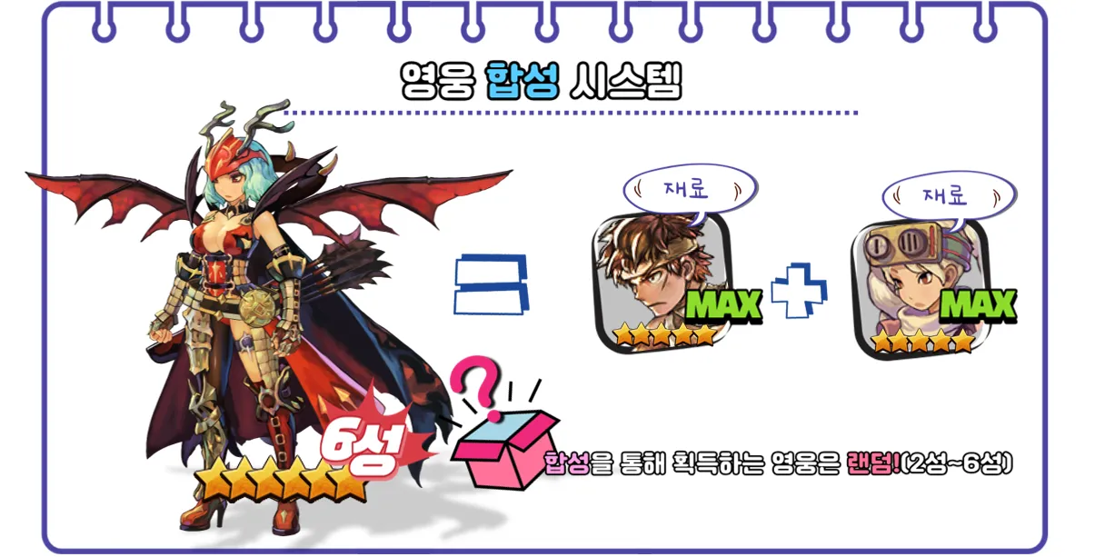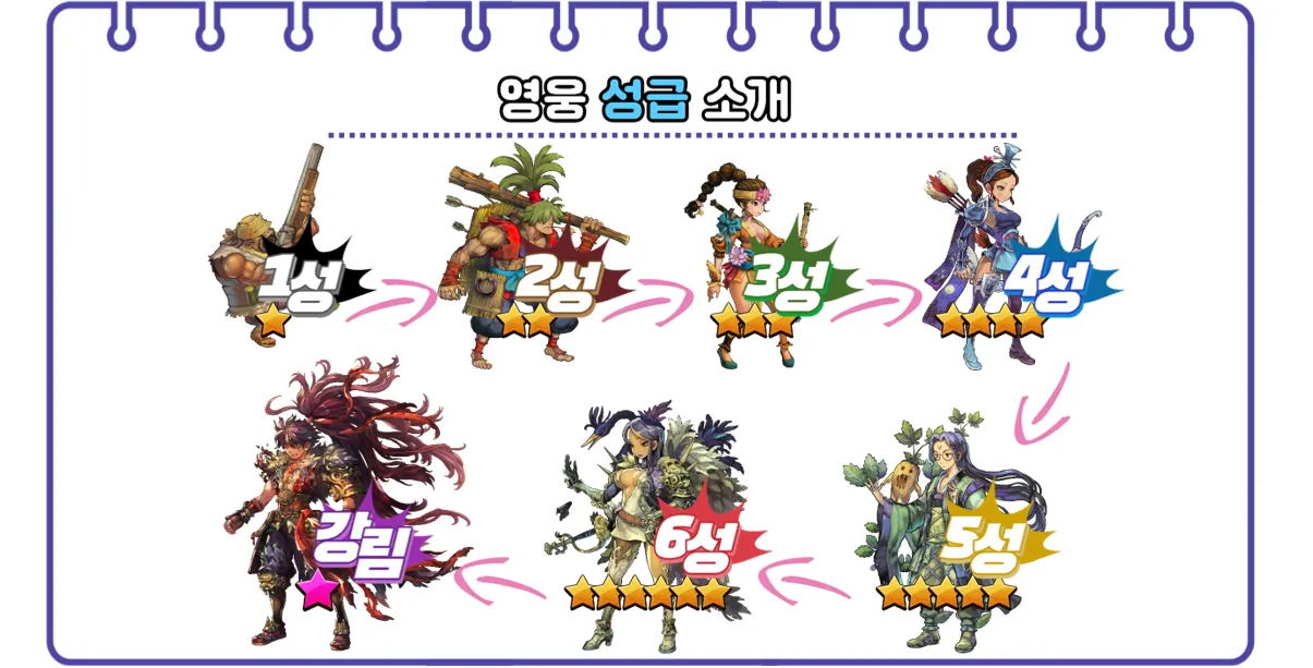 이때 영웅은 1성부터 6성까지 육성할 수 있는데, 이후 6성 영웅 2개를 강화 후에 합성하는 방식으로만 최종 등급인 강림 영웅을 확보할 수 있다.