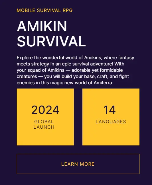 상기에 추가한 아미킨 서바이벌 홈페이지에 접속하면 해당 게임 정보를 영어로만 제공하는데, 포켓몬 또는 팰월드 유사 게임으로 알려져 있다.