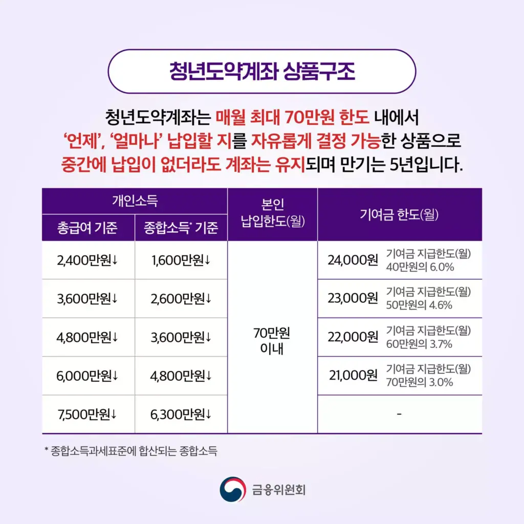 만 19세부터 34세까지 청년 중 종합소득이 연 6300만원 이하 또는 총급여가 7500만 원 이하이고 가구 소득이 중위 소득 180% 이하를 모두 충족해야만 청년도약계좌에 가입이 가입할 수 있다. 매달 최대 70만 원씩 5년간 저축하면 5천만 원이라는 목돈을 마련할 수 있는 저축 상품이다.