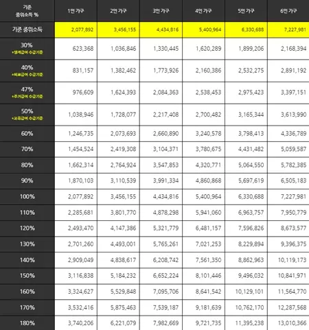 아래 표에서 가장 아래에 기준 중위소득 180%에 해당하는 금액을 참조하면 된다.
