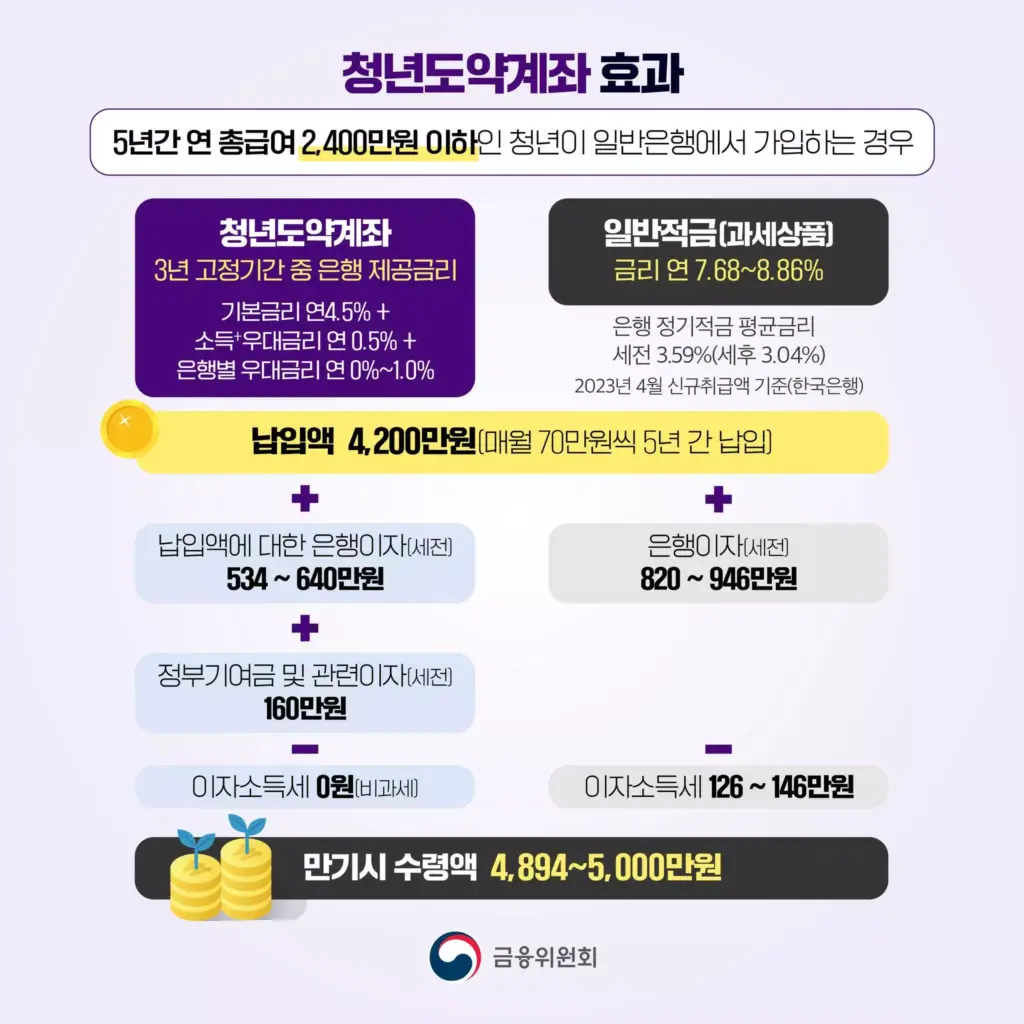 청년도약계좌는 매월 최대 70만원까지 납입이 가능한 5년 만기 자유적립식 적금 상품으로, 청년이 납입한 금액에 비례해 소득구간별에 따라 정부기여금을 지원한다. 또한 청년이 납입한 금액과 정부기여금에 대한 이자와 이에 대한 비과세 혜택도 주어진다.