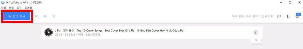 다음으로 4K YouTube to MP3 프로그램에서 상단에 있는 링크 복사 버튼을 누르기만 하면 자동으로 방금 전에 복사한 URL를 인식해서 해당 영상 속 음원만 추출하는 과정으로 돌입한다.