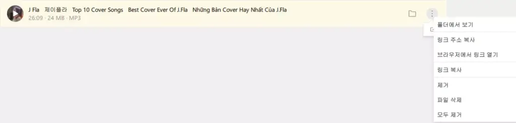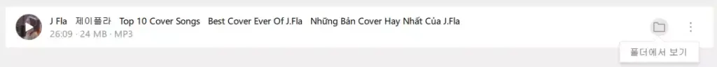 그러면 매우 빠르게 음원을 추출해서 MP3 파일로 저장하는데, 해당 파일 우측으로 마우스를 올리면 다운로드 폴더 및 옵션 표시가 나오므로 이를 활용해 해당 다운로드 폴더로 가거나 필요없는 파일을 삭제할 수도 있다.