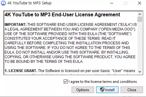 다운로드한 4K YouTube to MP3 설치파일을 더블클릭한 후에 라이선스 팝업에서 동의 항목에 체크한 후에 Install 버튼만 누르면 간단히 4K YouTube to MP3 프로그램을 설치할 수 있다.