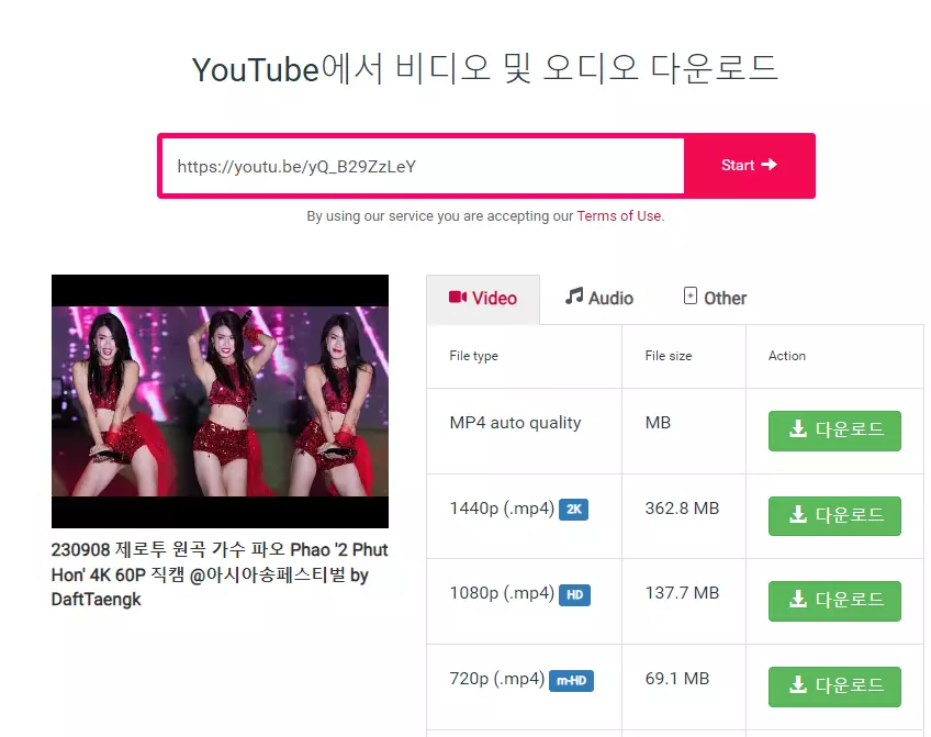 바로 상기에 나오는 영상이 Y2mate로 차출한 제로투 원곡 가수 파오 유튜브 영상으로, 해당 영상을 누르면 원본 유튜브 영상으로 연결한다.
