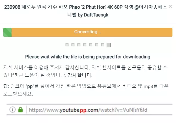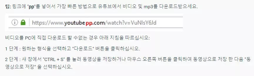 참고로, 유튜브에서 스트리밍 영상 또는 음악을 다운로드할 시에는 간단히 URL 주소에 PP만 추가하면 바로 Y2mate 웹사이트로 전환하므로 더욱 간편하게 원하는 영상 또는 음악을 추출할 수 있다.